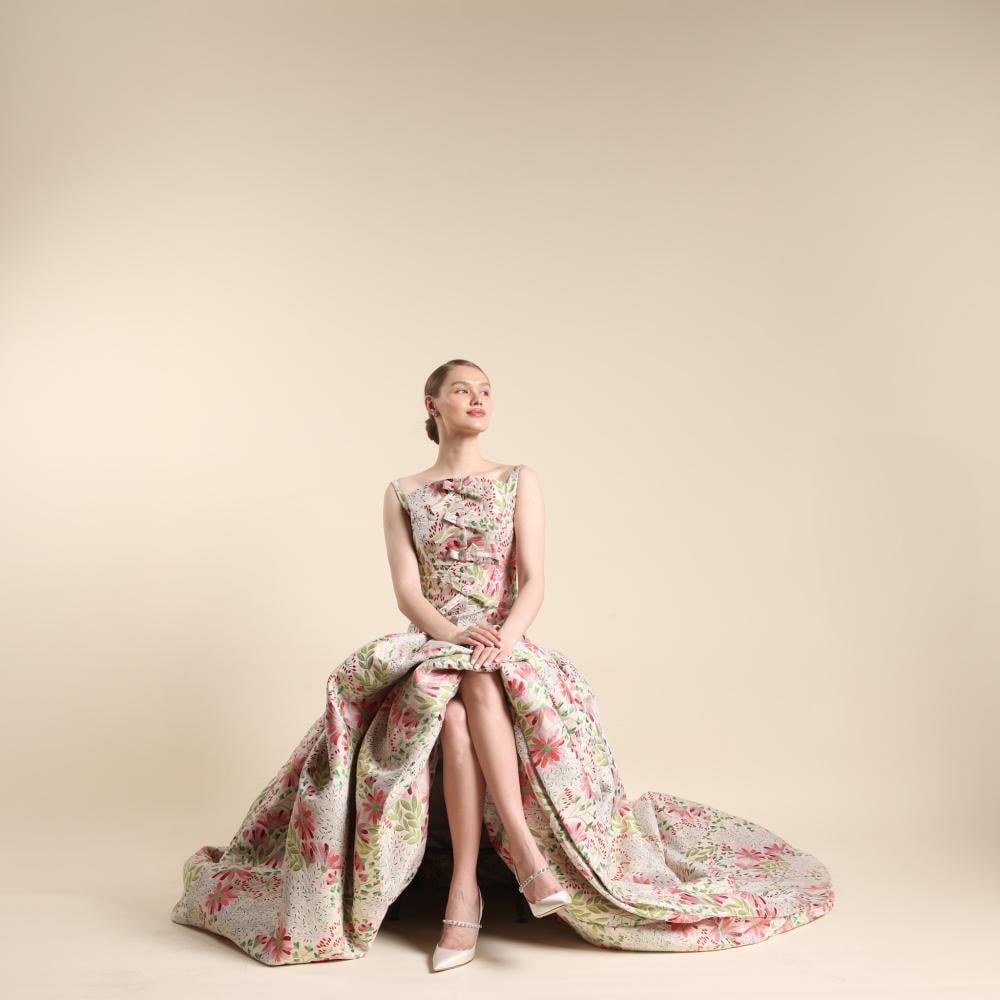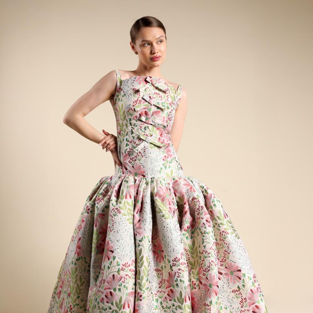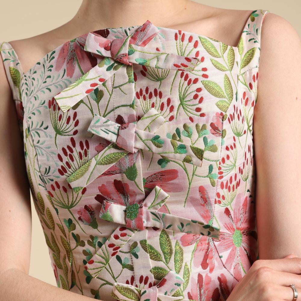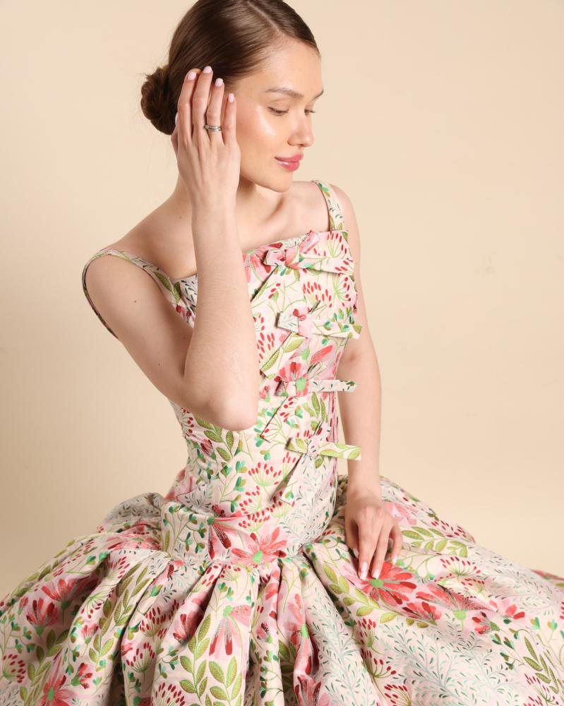 فستان من تفتة الجاكار المطبوعة بنقشة الزهور، بصدر منحوت وفيونكات لطيفة، يعكس رقة الربيع.