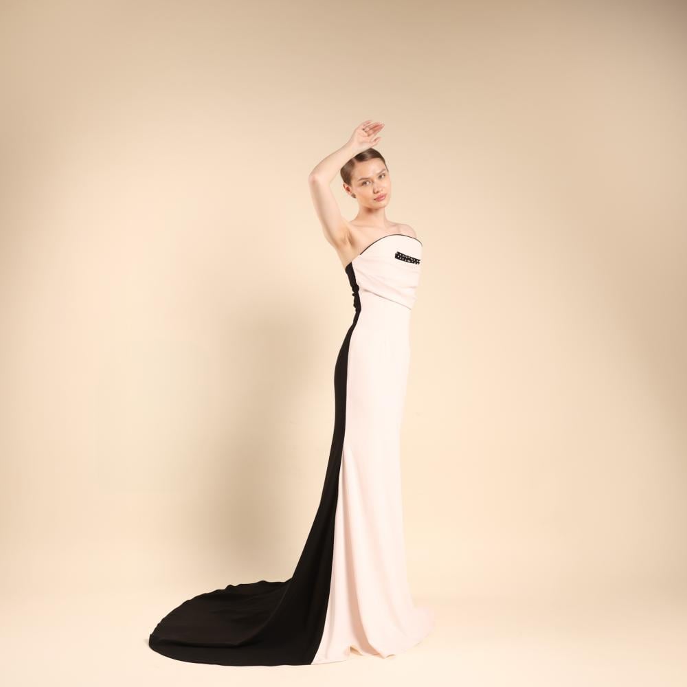 A sculpted strapless gown in soft blush with a bold black tail, designed to command elegance and confidence.