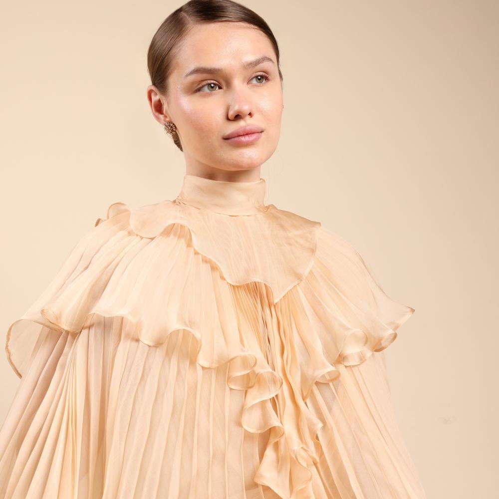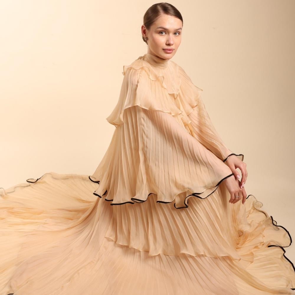 A flow pleated natural chiffon gown in sandy beige, adorned with delicate ruffles and soft black trim. Timeless, romantic, and effortless.