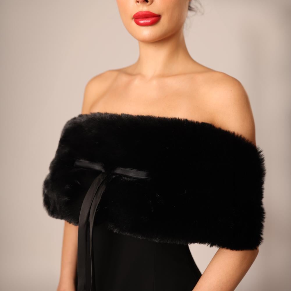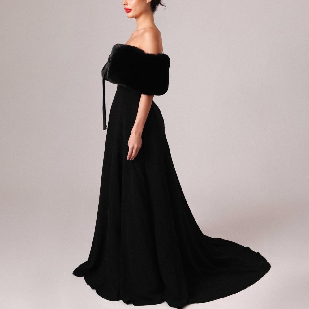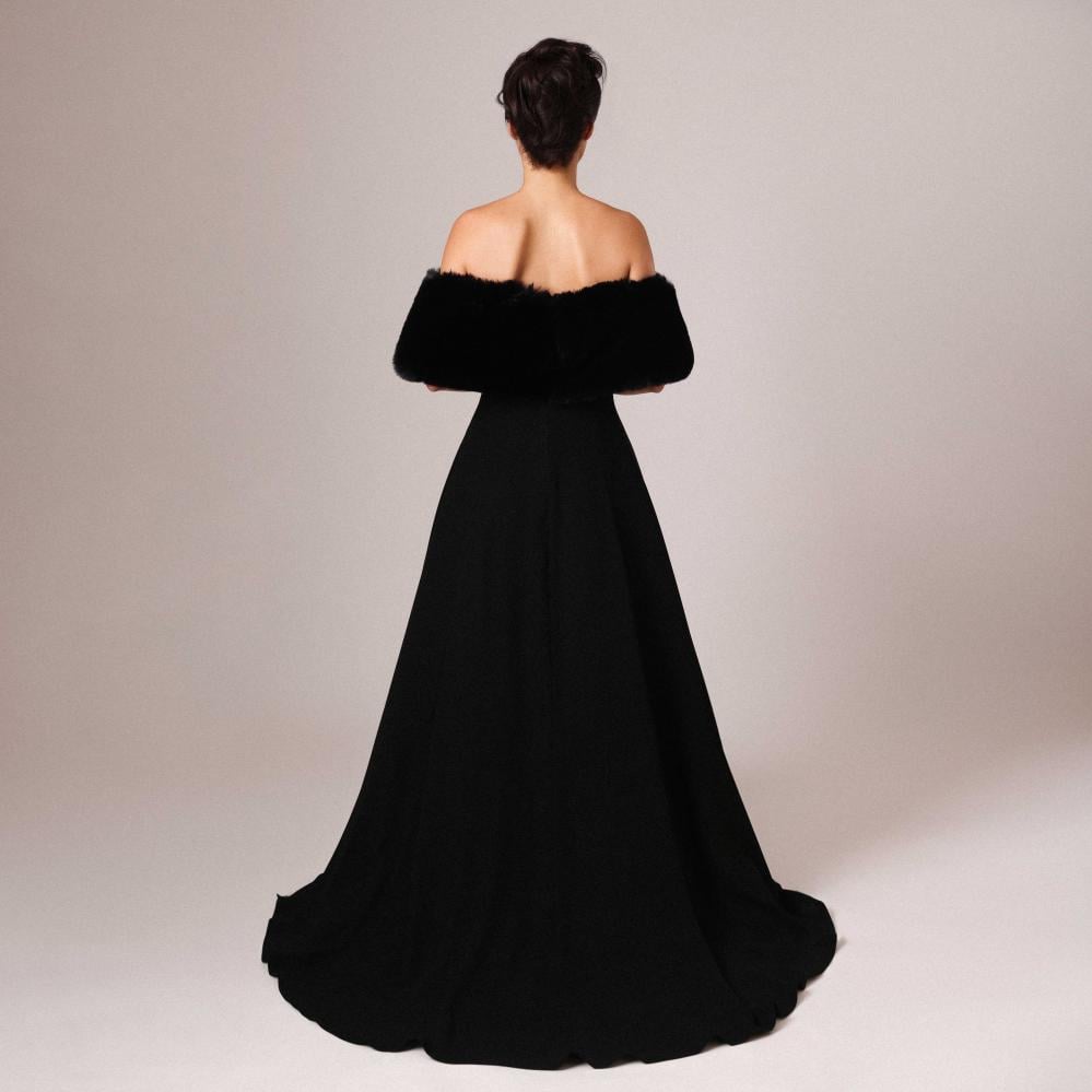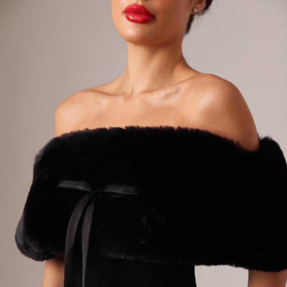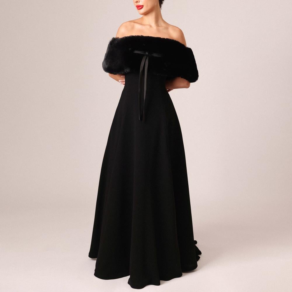 يتميز هذا الفستان الأسود الأنيق مكشوف الكتفين بقصة مستوحاه من نمط الأميرات الكلاسيكية التي تبرز القوام بفضل صدره الضيق وتنورته الواسعة. يبرز التصميم المكشوف من الرقبة والأكتاف جاذبية القوام، بينما يضيف طبقة الفرو الناعمة لمسة من الفخامة. يكتمل المظهر بعقدة شريطية راقية عند الصدر، مما يعزز المظهر الراقي والجميل للفستان.