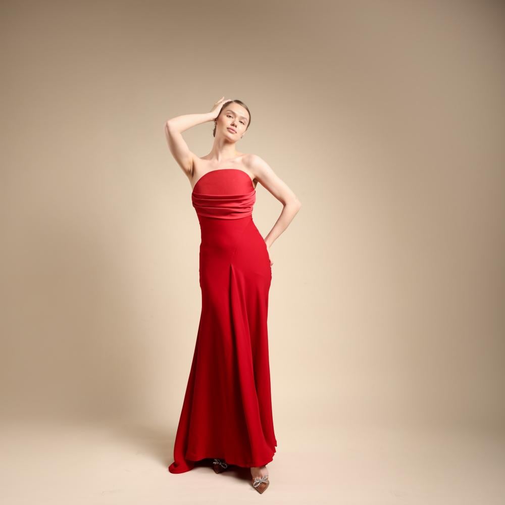 A refined strapless gown in deep scarlet, featuring soft draping that hugs the figure with understated elegance and poise.