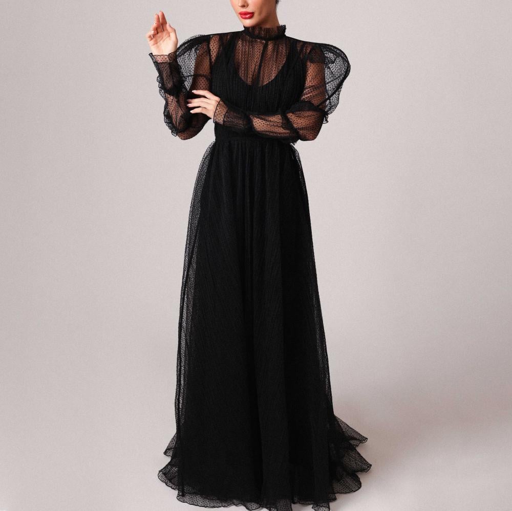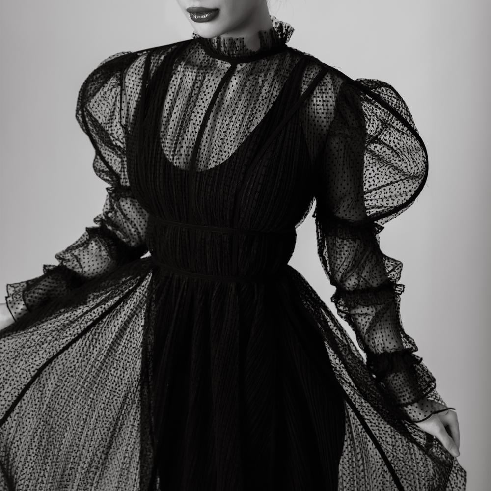 This stunning dress is crafted from luxurious spotted tulle, which is structured with delicate strings. The tulle’s spots create a refined texture, while the strings enhance the dress's shape and design, making it a standout piece of elegance and craftsmanship.